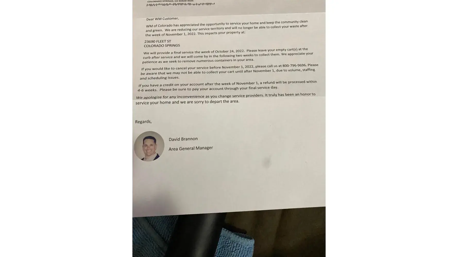 I was sent a letter saying I could get a refund for services not rendered. WM sent a letter saying this, see photo, because they are no longer picking up in my area. They told me I could not have a refund on service they did not provide, out right refused, even though they sent a letter saying I deserved a refund. In 5 weeks the trash has been picked up 2 times, and before that, I was lucky if they did come every week.
