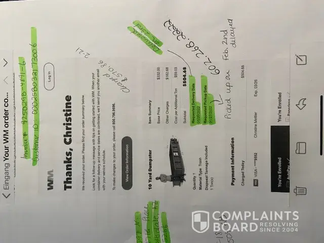 I specifically requested the dumpster to be delivered on Thursday, January 20th and the pick-up date agreed upon was Thursday, January 27th. This was confirmed in writing by your company.