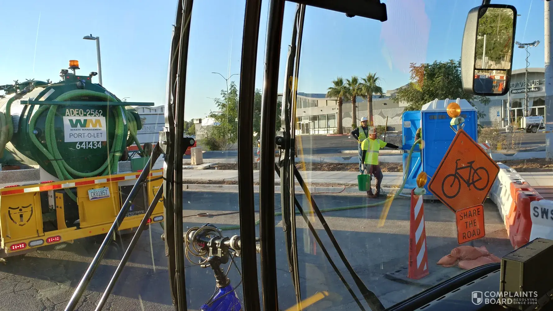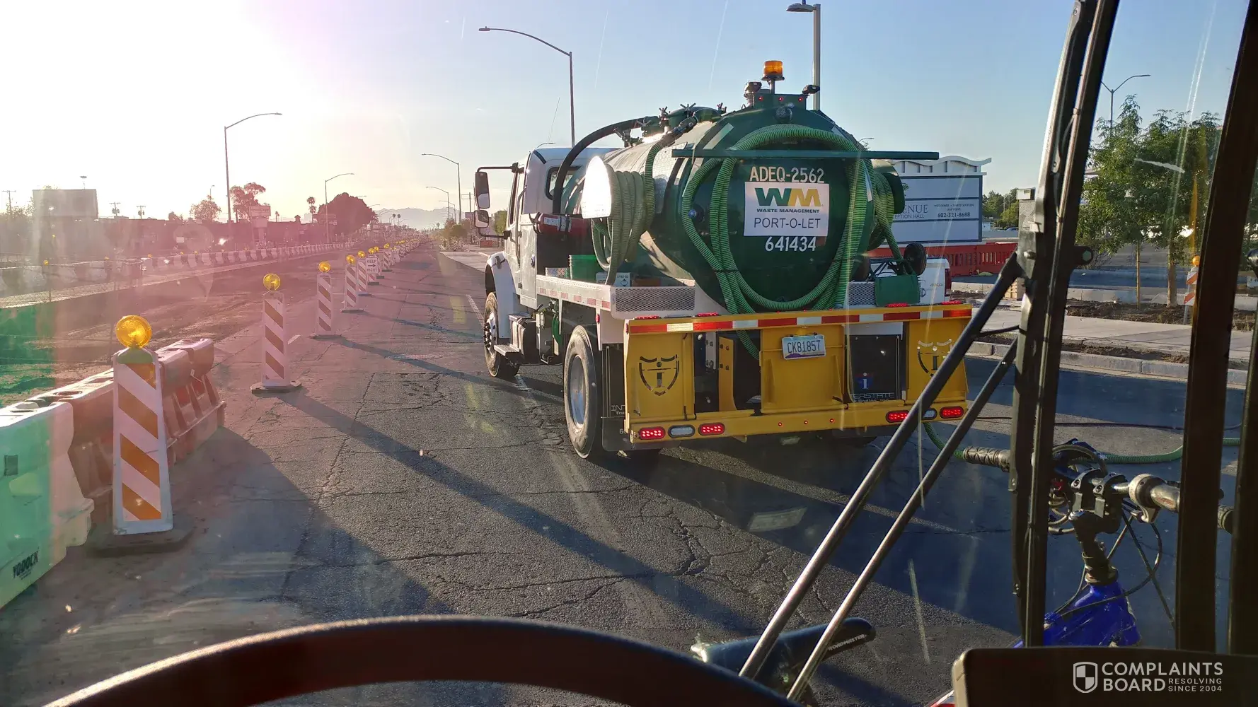 This morning around 6:05 am i was driving on main st in Mesa Az when one of your port a potty cleaning crew was just park in the middle of the road blocking traffic for about 10 min. They coukd have parked closer to the curve or even inside the parking lot so they can do their jib and not just blocking the road specially when there is only one lane of traffic because of the light rail construction.