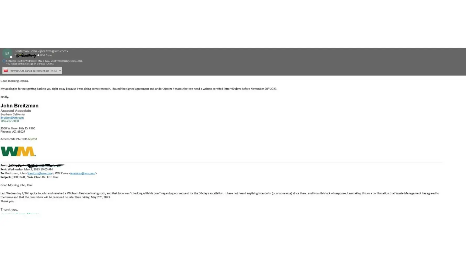 Last Wednesday 4/26 I spoke to John and received a VM from Raul confirming such, and that John was “checking with his boss†regarding our request for the 30-day cancellation. I have not heard anything from John (or anyone else) since then, and from this lack of response, I am taking this as a confirmation that Waste Management has agreed to the terms and that the dumpsters will be removed no later than Friday, May 26th, 2023.