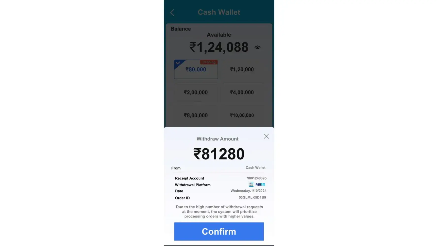 I play water short game with amount after withrwal going for process pay rs. Of 2000/_ above I pay but after not process complaint 100%