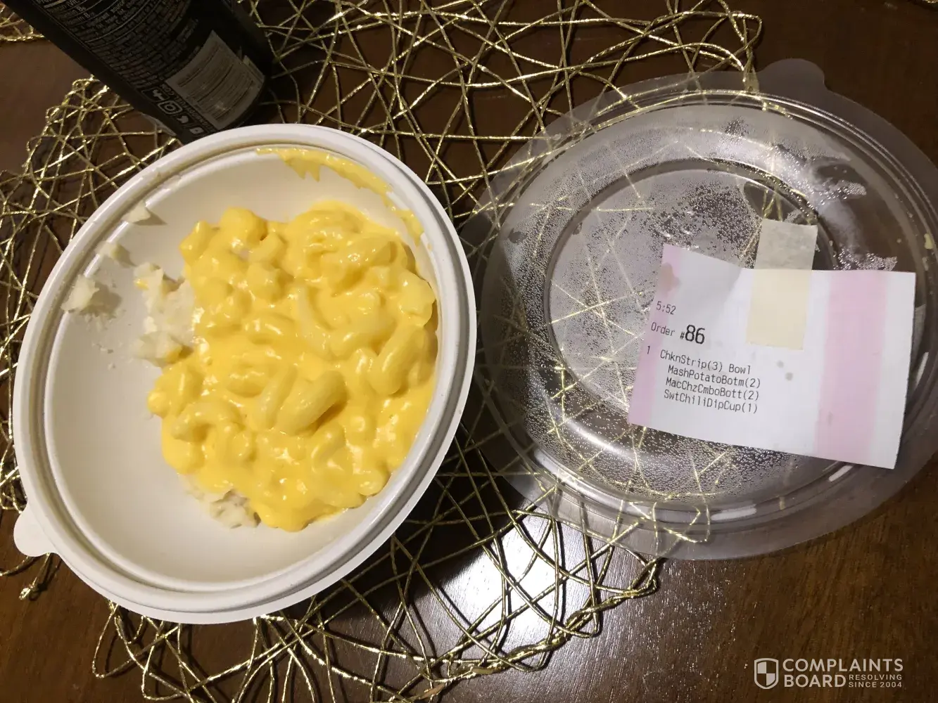 I just got done my basketball game and stopped at Wawa for a later dinner and to fill up my tank before work tomorrow. I ordered the 3 chicken tenders with mac-n-cheese & mashed potatoes in a bowl. When I got home to eat, I opened the bowl up to find no chicken tenders. I don't need to explain how frustrating that is. I paid $5.99 for this. Please see the...