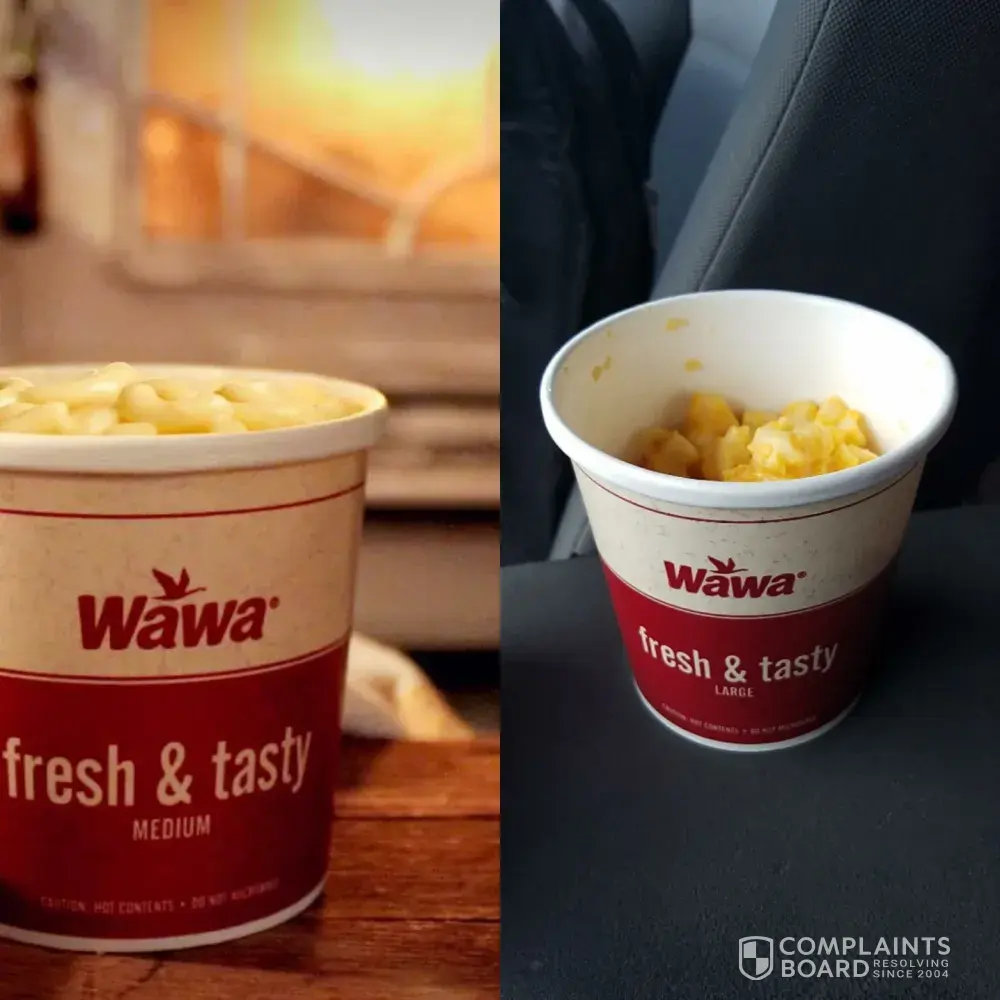 My husband went to the Claymont Delaware store, yesterday on 5/22/18 and ordered a large mac and cheese. When he was in the car he opened the Mac and cheese and found that the container was not filled up. He went back to the deli counter and showed the associate the half empty container. She replied that the policy is to fill it to the red line and then she turned around and would not discuss any further. We are extremely disappointed in the customer service and the disrespect that was shown in this encounter by wawa staff. Below is a picture of wawa's promotional picture for their Mac and cheese versus what we received yesterday.