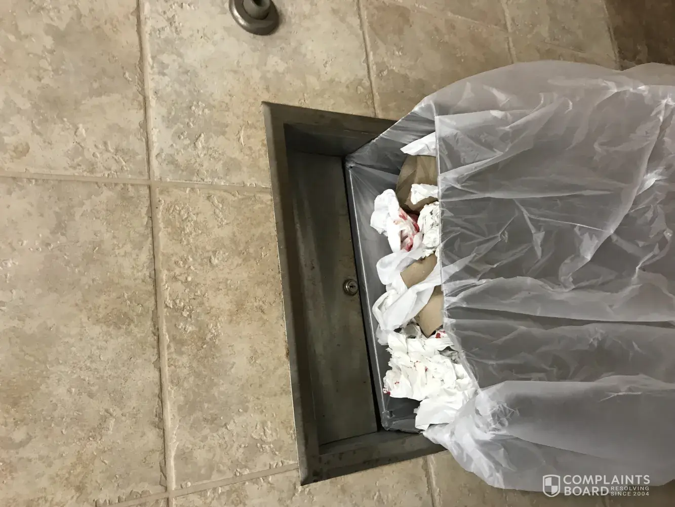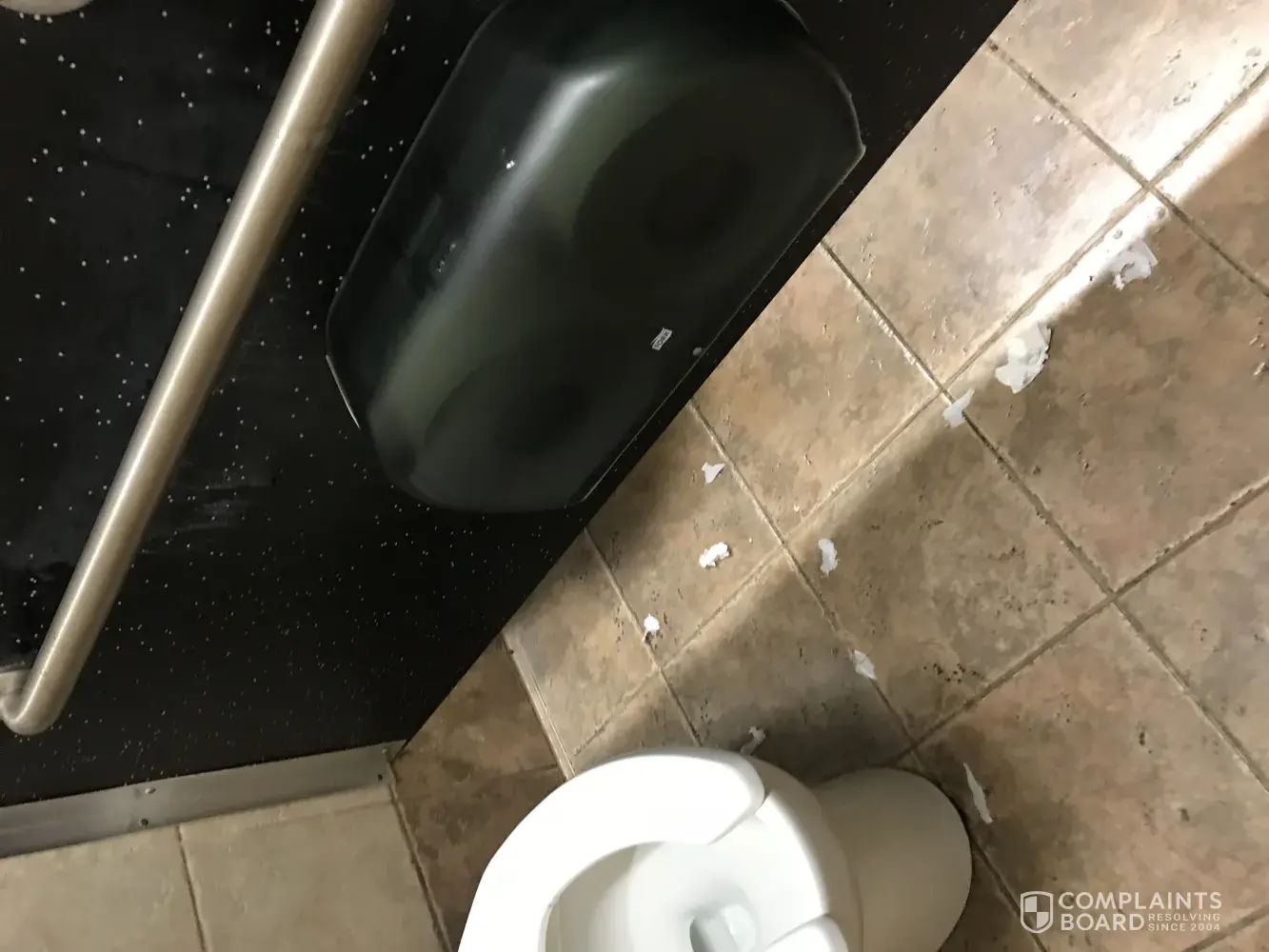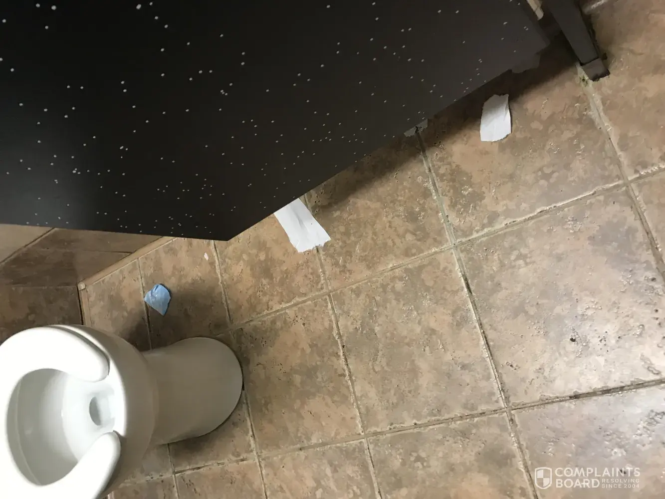 I do have pictures to show The unkempt restroom. Toilet paper on the floor scattered through out the stalls, the toilet seat were not cleaned inside and out, the back area of the toilet was nasty. The trash bin was overflowing in the common area and the stalls. I felt a sign should have been posted "USE AT YOUR OWN RISK"