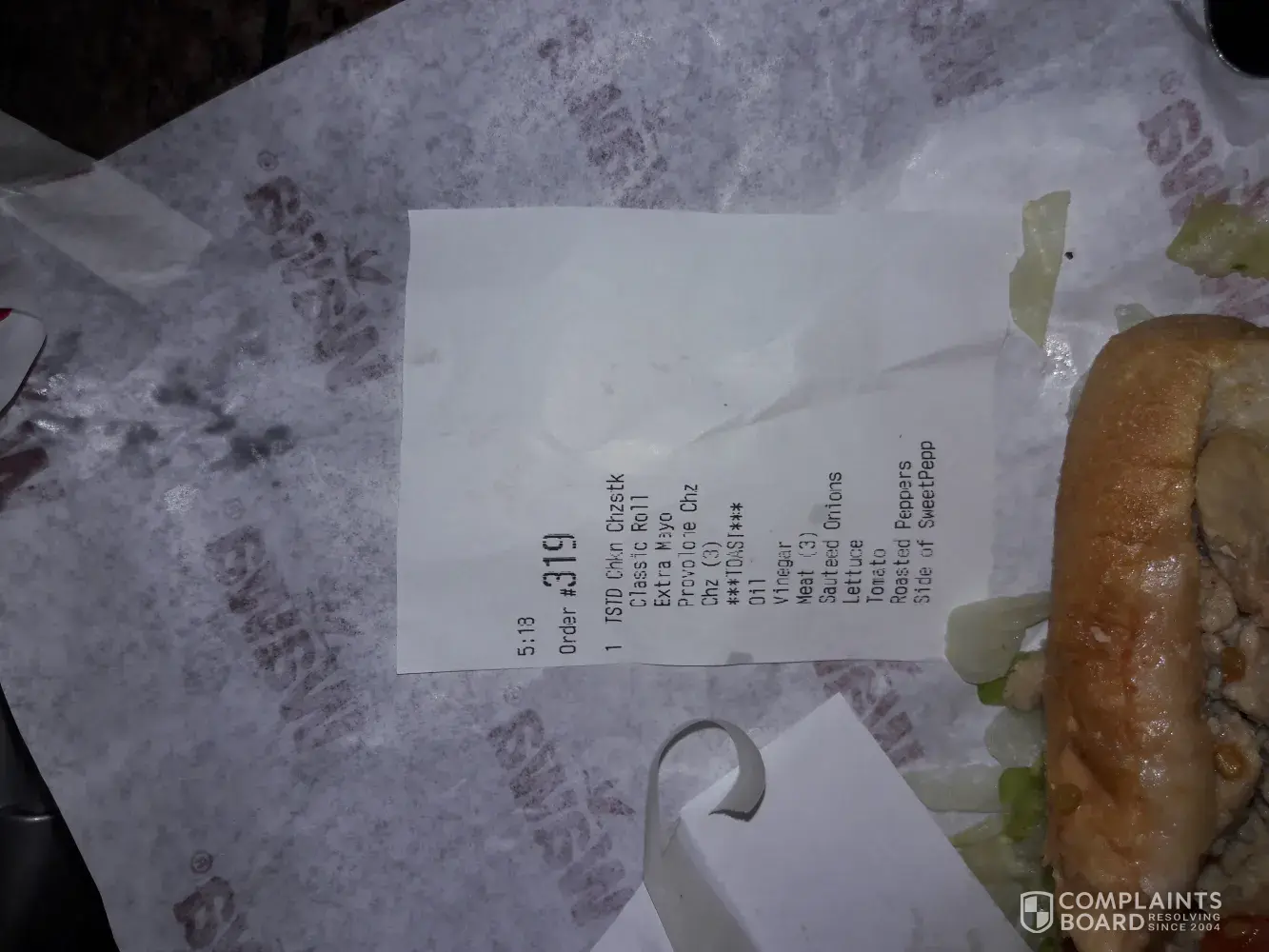 I ordered a 10' inch custom chicken cheeseteak sub which was suppose to be toasted and include the vegetables i asked for. Mostly none of my items were located on the sub. I was missing 5 items from my sub which left it untasteful and dry. There were no extra mayo, no roasted red peppers, no oil and vinegar or sweet peppers. I feel as though my sub was rushed. I was unable to go back to wawa because I had already gotten settled in my home after a long days of work.