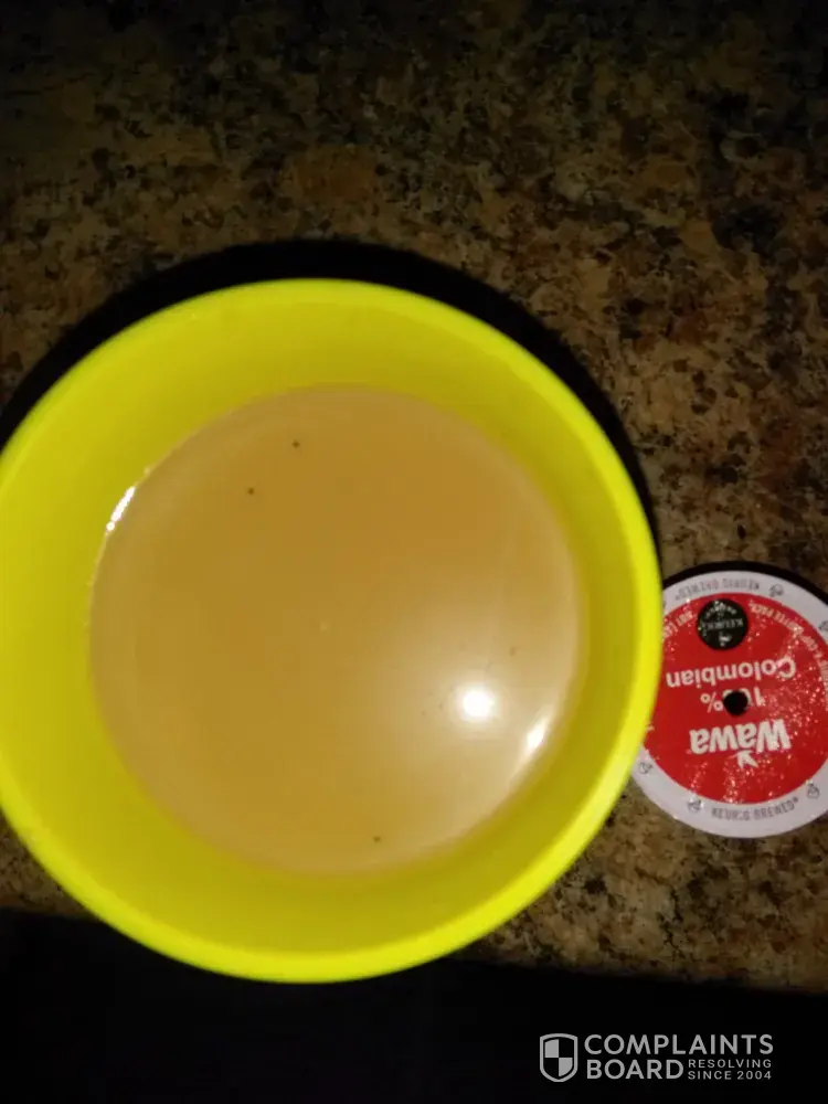 I am a very loyal customer to my local wawa mostby employees know me by name, I am in there almost everyday buying coffee, I also buy their kcups! I have never had a problem with the kcups in the past I recently bought two boxes and am now having issues. I have had to throw out 7 cups of coffee now due to majority of the coffee grounds because in the cup, it's not just a few it's about half of them! When I use my other brands of hot chocolate and cappuccino it does not happen so I've ruled out it's not my keurig. Your kcups are not cheap but my husband and I love your coffee so much we don't mind spending the extra couple bucks for them but with this happening I have almost thrown away a whole box I've had one cup out of all 8 I've used brew normally. I took pictures of the last two cups, most of the grounds were all on the bottom.