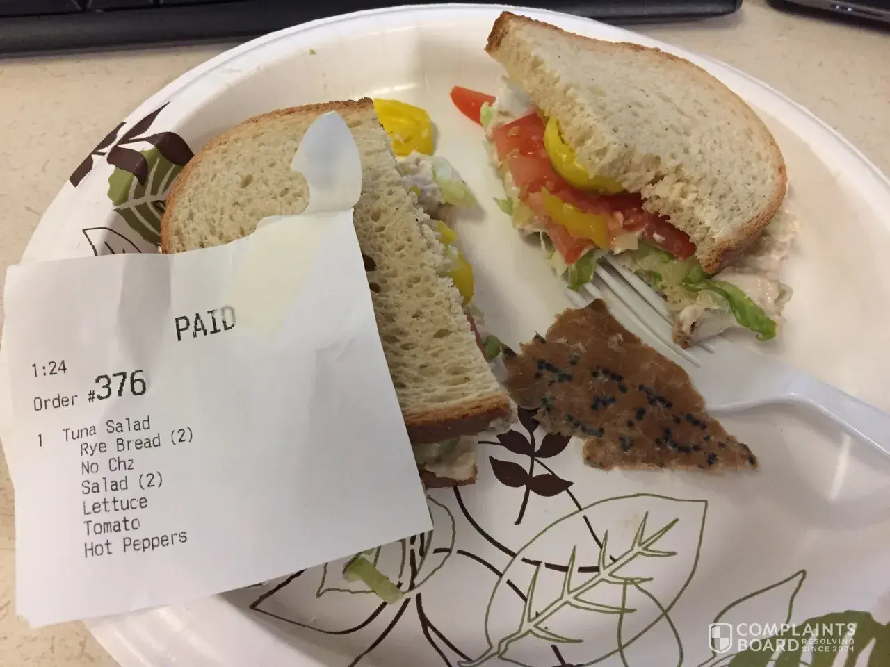 Wawa tuna sandwich on rye with some type of paper in sandwich