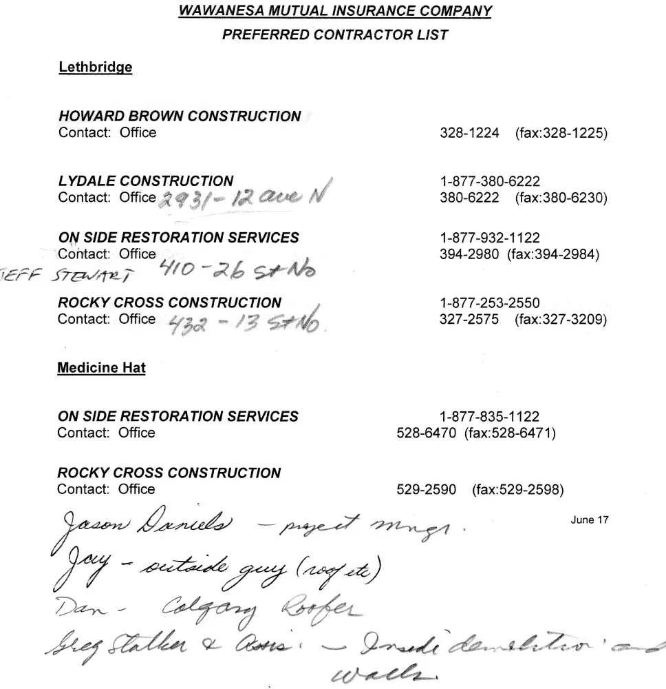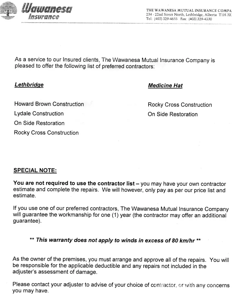 Howard Brown const. on the preferred contractors list was the one the Wawanesa roofer pushed onto our roofer to be the umpire on the attachments here.