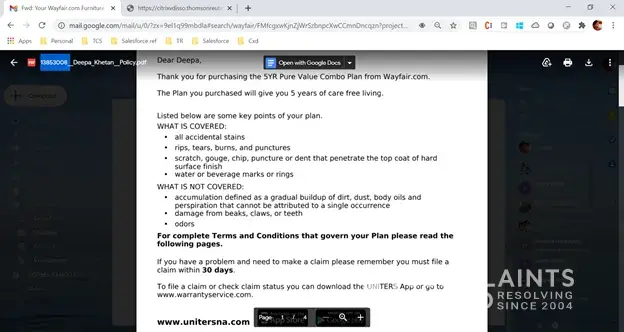 We also asked them to work their insurance Uniters for specific issue and also Wayfair miscommunciation during buying the policy.