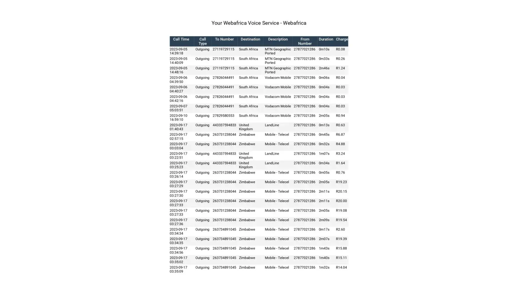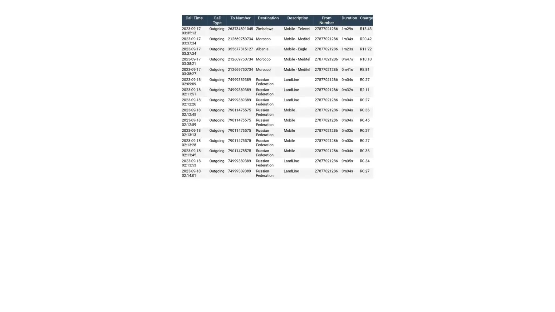 The calls made on my Voip line were to Albania, Russia, the United Kingdom, Zimbabwe, and Morocco. I do not know anybody in those countries; I have two numbers I use the Voip for and hardly ever use it. It is mostly for times when I am low on airtime.