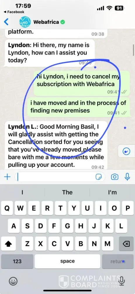 [2023/12/31, 09:42:42] Webafrica: *Lyndon L.*: Good Morning Basil, I will gladly assist with getting the Cancellation sorted for you seeing that you've already moved,please bare with me a few moments while pulling up your account.