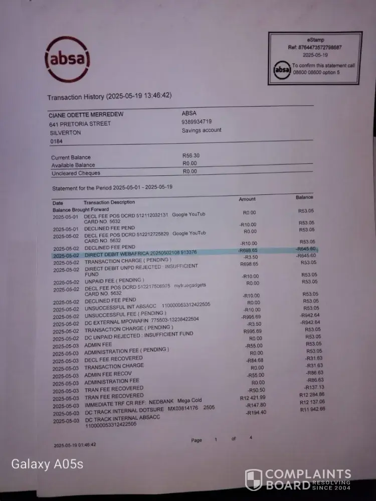 I took out another service from Afrihost and was active within 2 days. On 8 August, Webafrica debited my account for more than R400. I reversed the debit and flagged the debit as fraud with Absa.