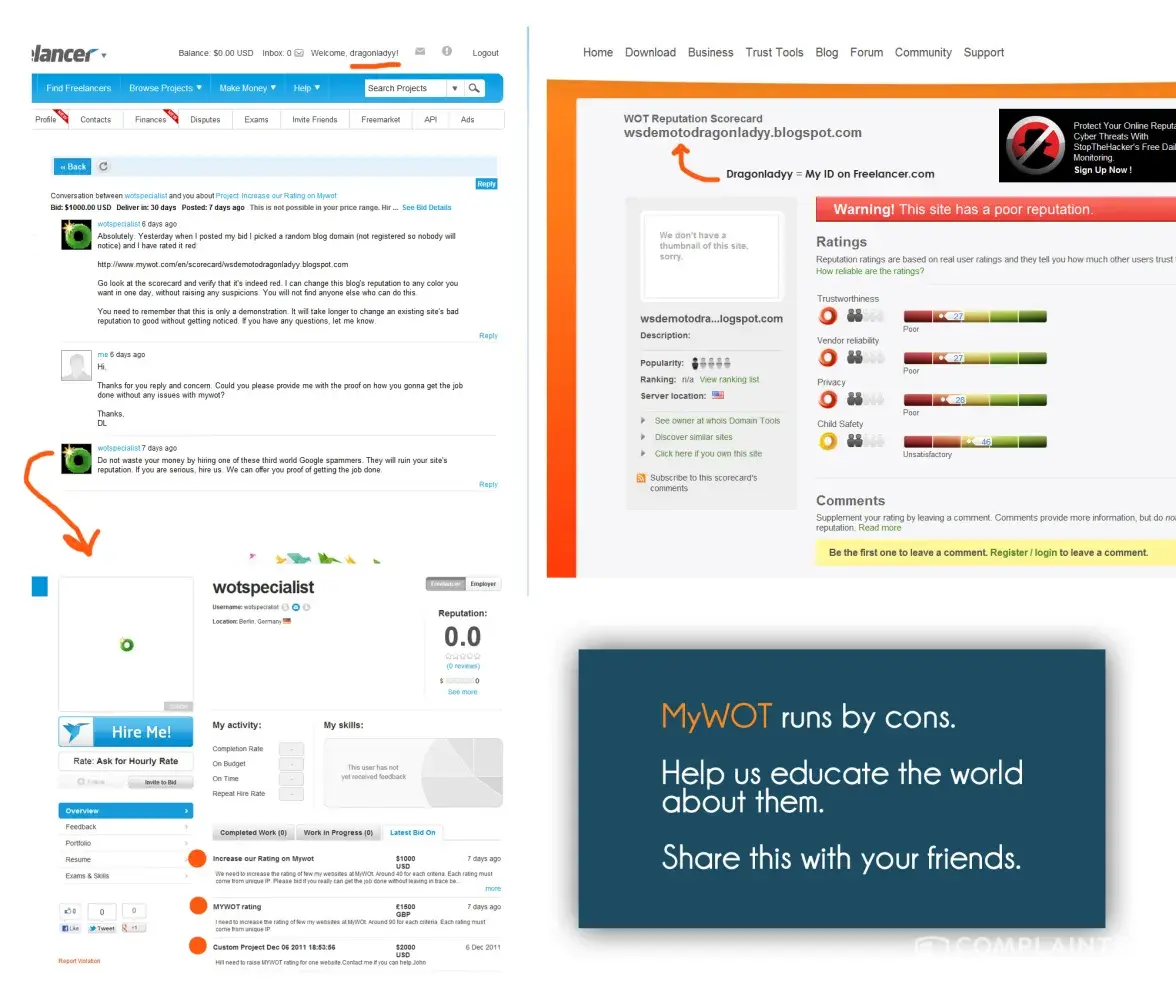 It seems that this MyWOT.com is going far far beyond ruining reputation of legitimate and well-known businesses. They're trying to write as much negative reviews as possible against website on the net to grasp the attention of the business owners. Once the business owner contact them about the false reviews, they ask him/her to go to their forum and beg for another evaluation. Sounds fun right?
