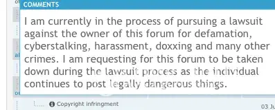 Seems like there is no real legal help or information here. They don't help anyone. If you post a comment once in a while a little helpful. Not much this forum offers. Seems like a bunch of old farts that sit behind a computer and act tough and smart. Nothing has really been a learning experience at this forum. Sister websites like thelaw.com, forum...