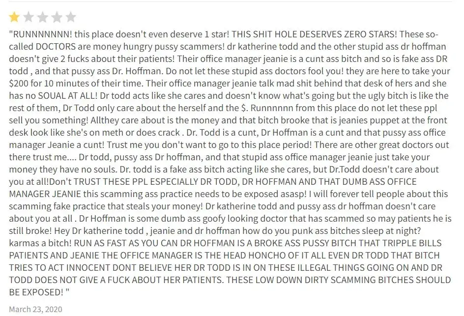 I was researching Dr. Kathleen Luise Todd, DO https://doctor.webmd.com/doctor/kathleen-todd-c521ba3c-1cb5-474b-840f-ccbd6aa29cad-overview on your site and the first review I read was from 2020, and it was so OFFENSIVE and INAPPROPRIATE that I couldn’t believe it hasn’t been removed by now. It was obscene, profane, defamatory, harassing, abusive, slanderous, hateful, and I was embarrassed for the Dr. I hope that you review this review and remove it for obvious reasons.