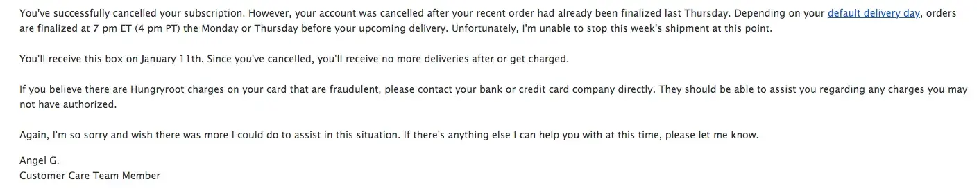 In 2017 I had a Hungry Root acct. I only ordered once and then cancelled the "subscription". Too pricey for what you get. Anyway, I logged in for the FIRST TIME SINCE 2017 on Jan 3rd, 2021. I wanted to see if menus had changed and if the pricing was any better. They were not, so I logged out. I got an email Jan 6th, 2021 saying "my order would arrive Jan by...