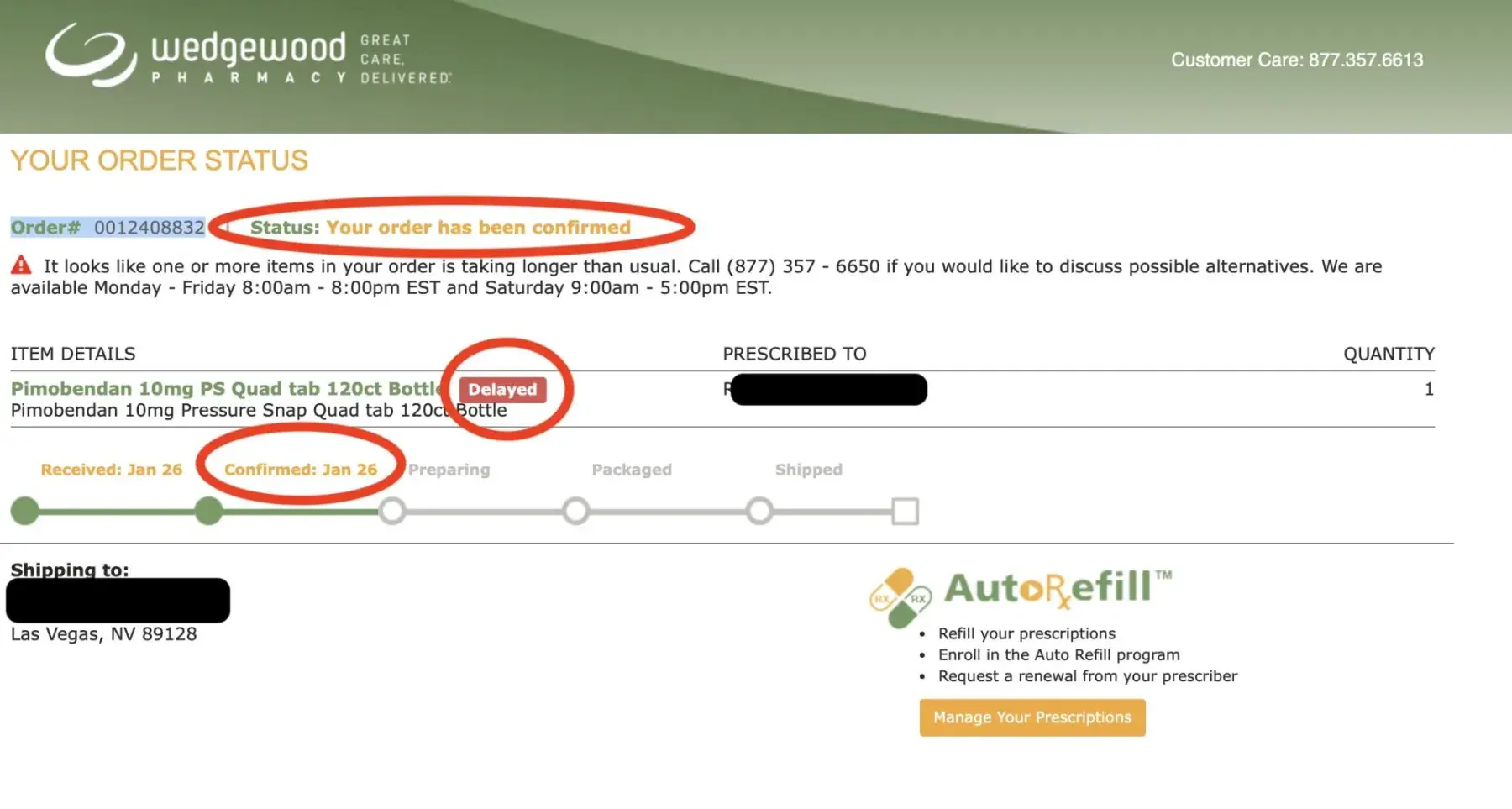 Terrible! I shoulda read these reviews before we started usin' this pharmacy. We just found out our dog has cancer. We only placed 2 orders for our dogs chemo, with Wedgewood and we had problems with the order both times. They are very misleading 'bout how long it will take to get the medication. For our most recent order I actually spoke to a live technician on Wed. 12/14/22 and was told my order was shippin' that day for delivery on 12/16/22. Then on 12/16/22 I get an email statin' my order is delayed. They gave no reason for the delay or when I should now expect the order. Keep in mind my dog is now outta his chemo. I called the pharmacy and was told it would now ship on 12/21/22! They gave no reason for the delay. There website states that it takes 2-3 business days to process an order. It's more like 10.