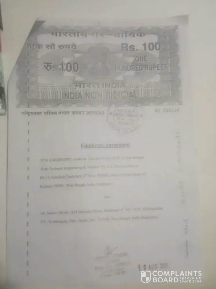 I am Saurav Ghosh, c/o - Gobinda Ghosh, B.P. C Institute of Technology 2017-2019 year student. I had joined and select the campusing in High-Technext Engineering & Telecom company held on 5th February 2020 at Ranaghat Government Polytechnic. I had joined on 31st July 2020 through a bond on the condition that I would get my money refund if I worked there for one year. The bond amount is 20000 rupees. After teaching some theory for 10 days, they gave me the conductor detail. Because that not a company. Then I refuse their proposal and said that I want my money because I am not interested work under conductor. And I had also said them you told me High-Technext Engineering & Telecom is a company but it not a company. And I had said them action against your company with notary that you give me. They refuse my application. Then I told all details to my college T.P.O who organise the campusing. He told me "first time I didn't realise that". I am belong to very poor family couldn't take any legal action. That problem faced not only me. That problem faced my one college friend, one another friend and 4 no of Odisha students and I contact with them. If you not believe that, you can panic yourself.