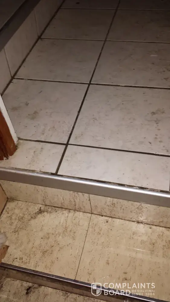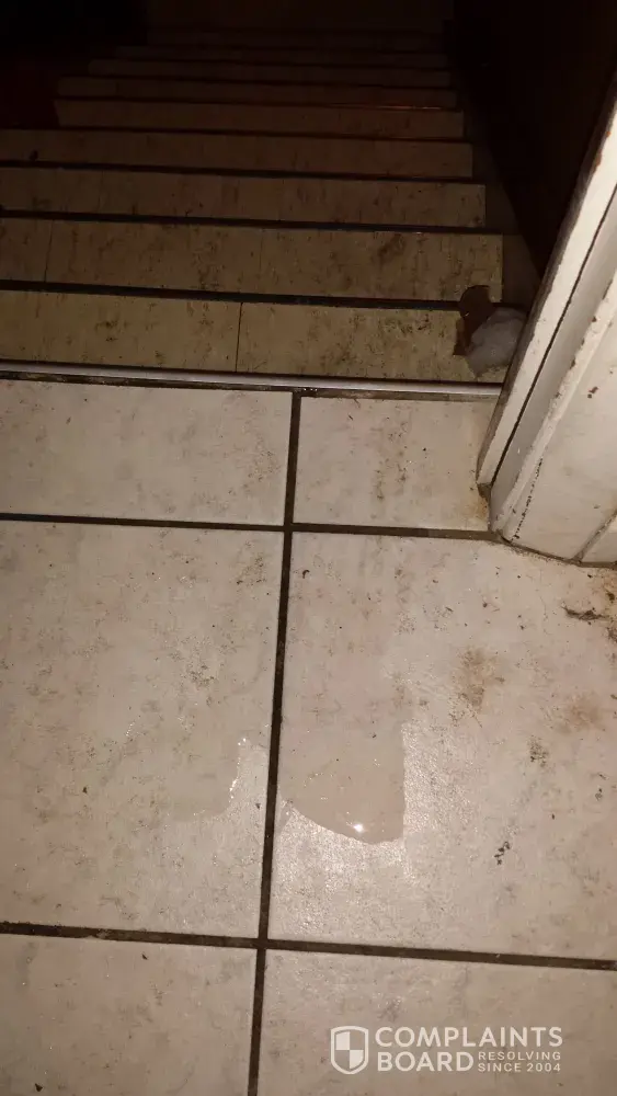 I should also point out that the cellar stairs and the hallway landing turned out to be wet from her niece and friend who had tracked water from the flooded basement. Also, the stairs have linoleum on them without the anti-slip strips. I did wind up taking pictures after the ambulance took her to the hospital and prior to me leaving for the hospital on the advice of the medics and police on scene.