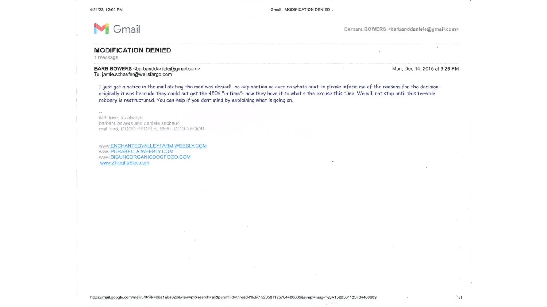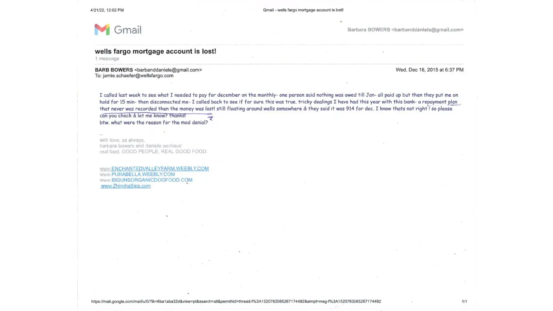 theres so much I hope I can remember everything . In 2004 Wachovia /then Wells Fargo.agreed to finance my home & property of 230K for 688/month for 30 years at 8 % interest. then shortly raised my monthly payments tripled of our original agreement but still at 8% when interest rates were everywhere 3%. I struggled , faltered & finally asked for refi in 2015. here begins the fun!(if you like fraud, you are going to love this!. they first said stop paying the monthly ,. you have 6 mo before foreclosure is instituted. so I did. then in the middle of winter in colorado, had to go into the WF branch to fax my docs thru th snow. so the excuse of "not a timely basis " could be the excuse! all requested docs were delivered the same day or within 24 hrs at the most. then half way thru they needed a 4506 from the IRS & when then IRs couldnt comply on time they denied the refi! And part of the way thru the refi they closed my mortgage acct reissued a new number so all history was lost! Added an acct for insurance without permission(dropped it after I complained but never refunded the money they charged me for) And when the refi was denied, because it took more than 6 mo for all this faldarall, started foreclosure proceedings! I was able to obtain help from my family to stop it but no thanks to WF ! because they canceled my first loan acct... it erased all history of a 10 year old bank loan so my credit rating fell to the floor.There are so many more incidents involved too numerous to list here but I have all the docs. they totally screwed me.I lost an entire year of life from running the docs around and worry and LOSTjob& lost 300K company & lost health! they owe me big time .I asked for legal help no atty would go there! will you dare!?the agents of refi were Jamie Schaeffer & Paige Brown. theres more I can provide!