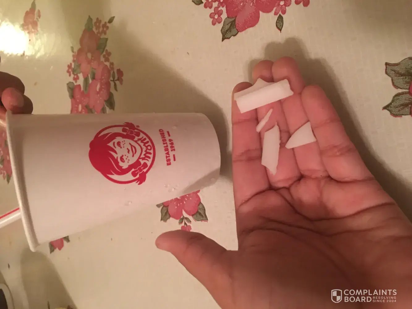 We bought three small chocolate frosty's at the 1792 Wendy's in Winter Springs, FL today (08/30/18) at 9:30 PM and while we were eating them we found fragments of white plastic in all three. We couldn't eat them.