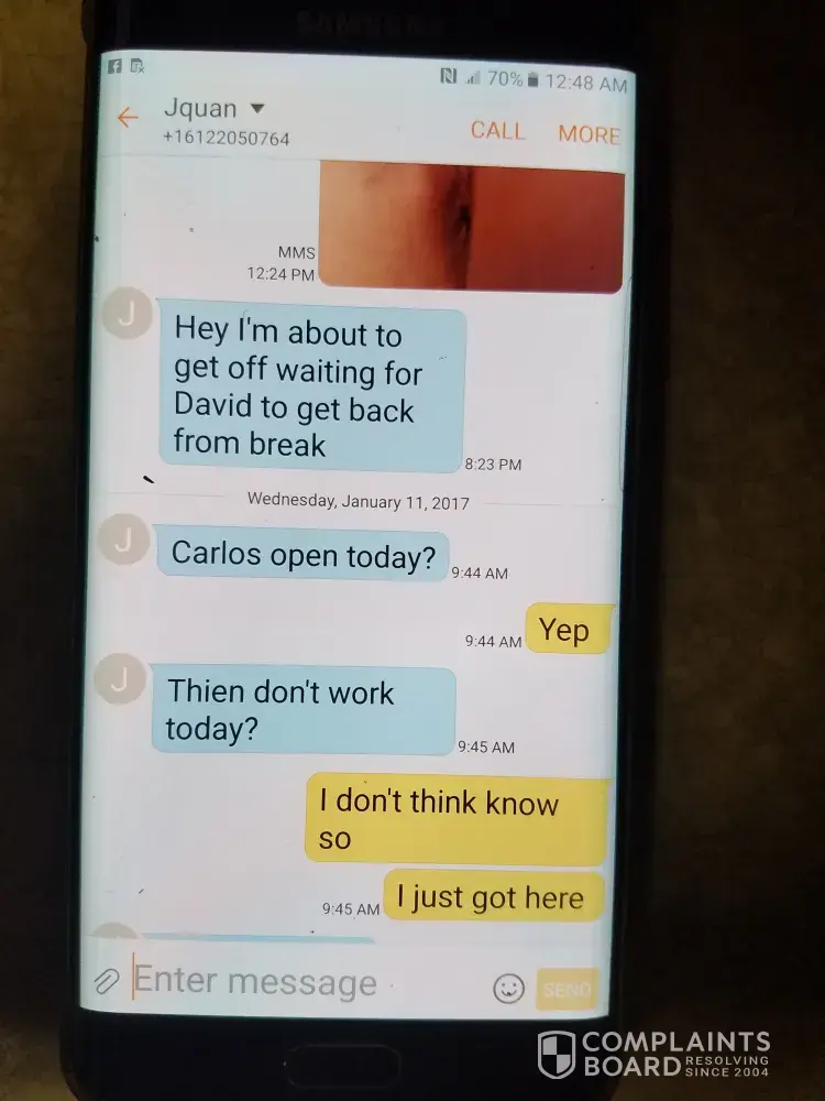 My wife regina carmack. Works at wendys in savage minnesota. Has been picking up employees for work schedules for over a year and having sex with them in my vehicle and in the cooler at work. I have all their text messages and pictures. Upon advising managers kevin (Regional) nothing was done. For a company who professes to care for kids our 11 yr old is tore up. Managers and employees envolved. Carlo Henry. J Quan Santiago, Johnny Walton, Nestor. Colina.