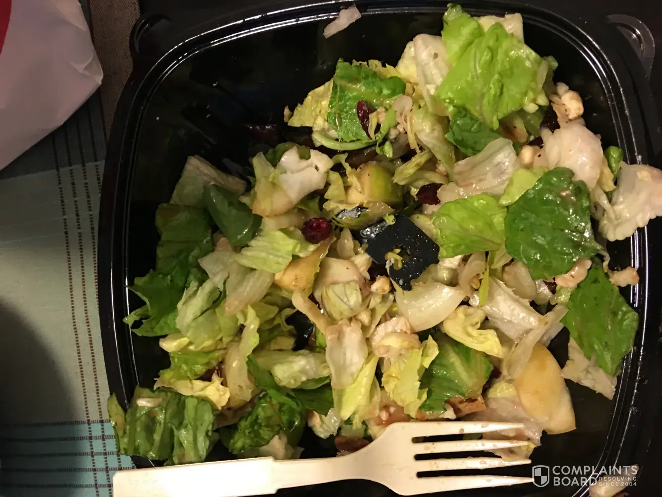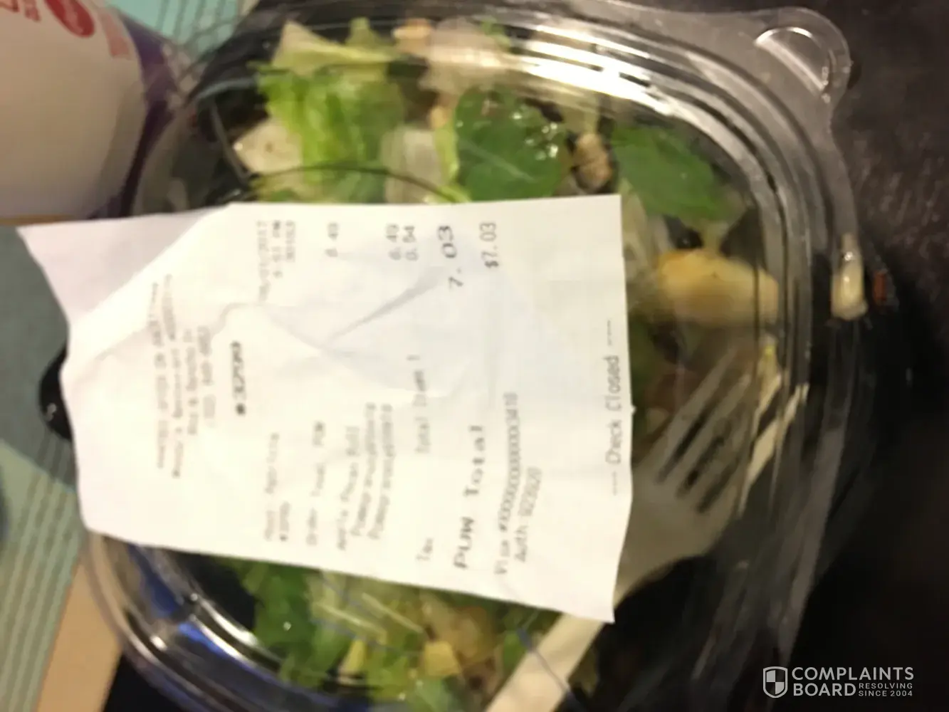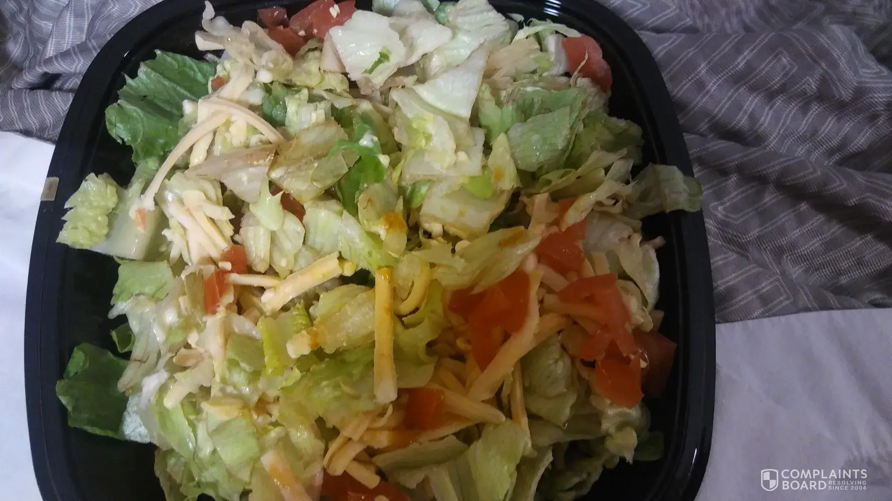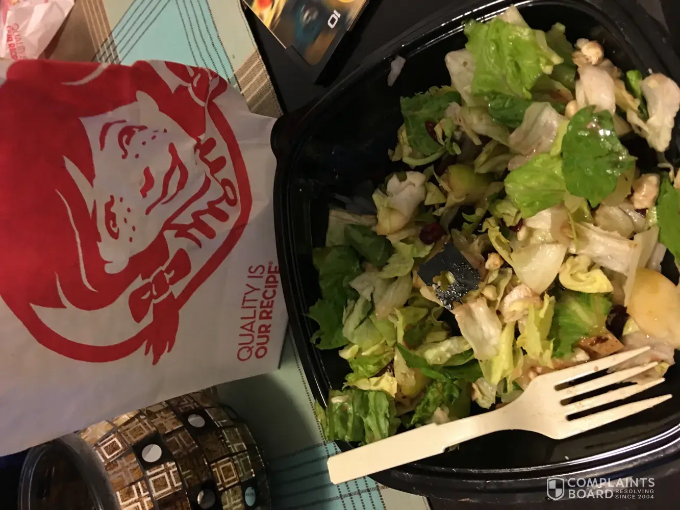Today I purchased a salad from Wendy's in Las Vegas store #[protected] order number 3299 host Patricia at approximately at 5:51pm I don't visit there often but when I do it's usually ok but today I stopped by to grab food once I got home which is about a ten minute drive from the restaurant I was eating my salad which was not that satisfying in the first place but I paid $7.03 for it so I wasn't going to waste my money I was halfway through the salad and I found a big piece of plastic at the bottom of my salad I immediately spit out the food I was obviously grossed out by it and thought the proper thing to do was submit a complaint.