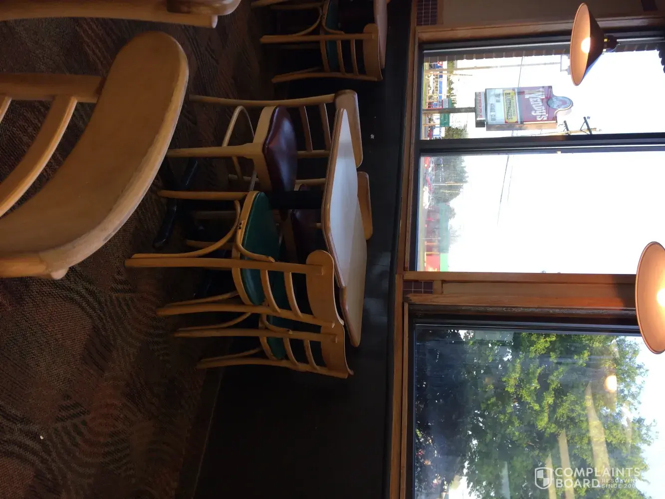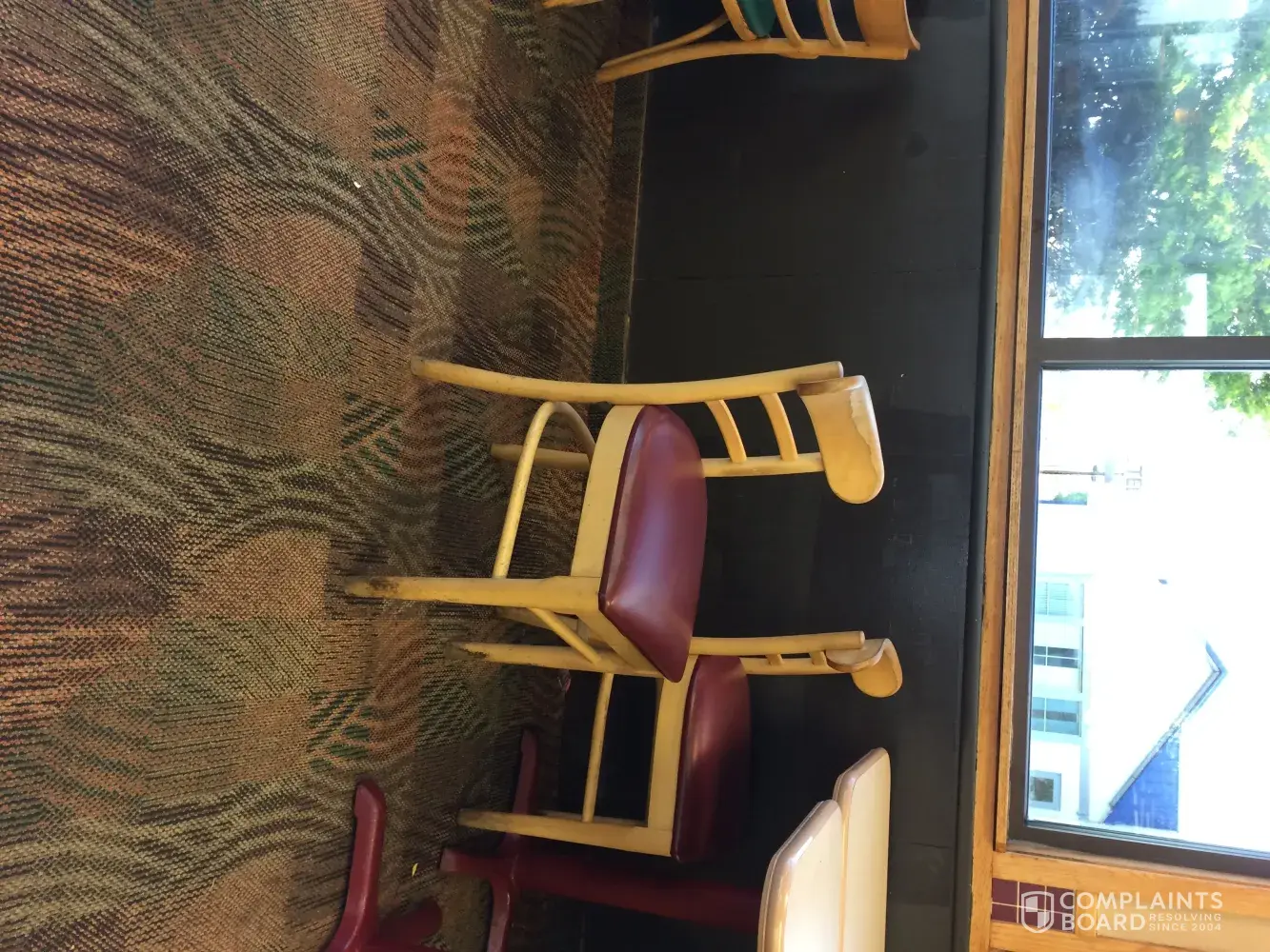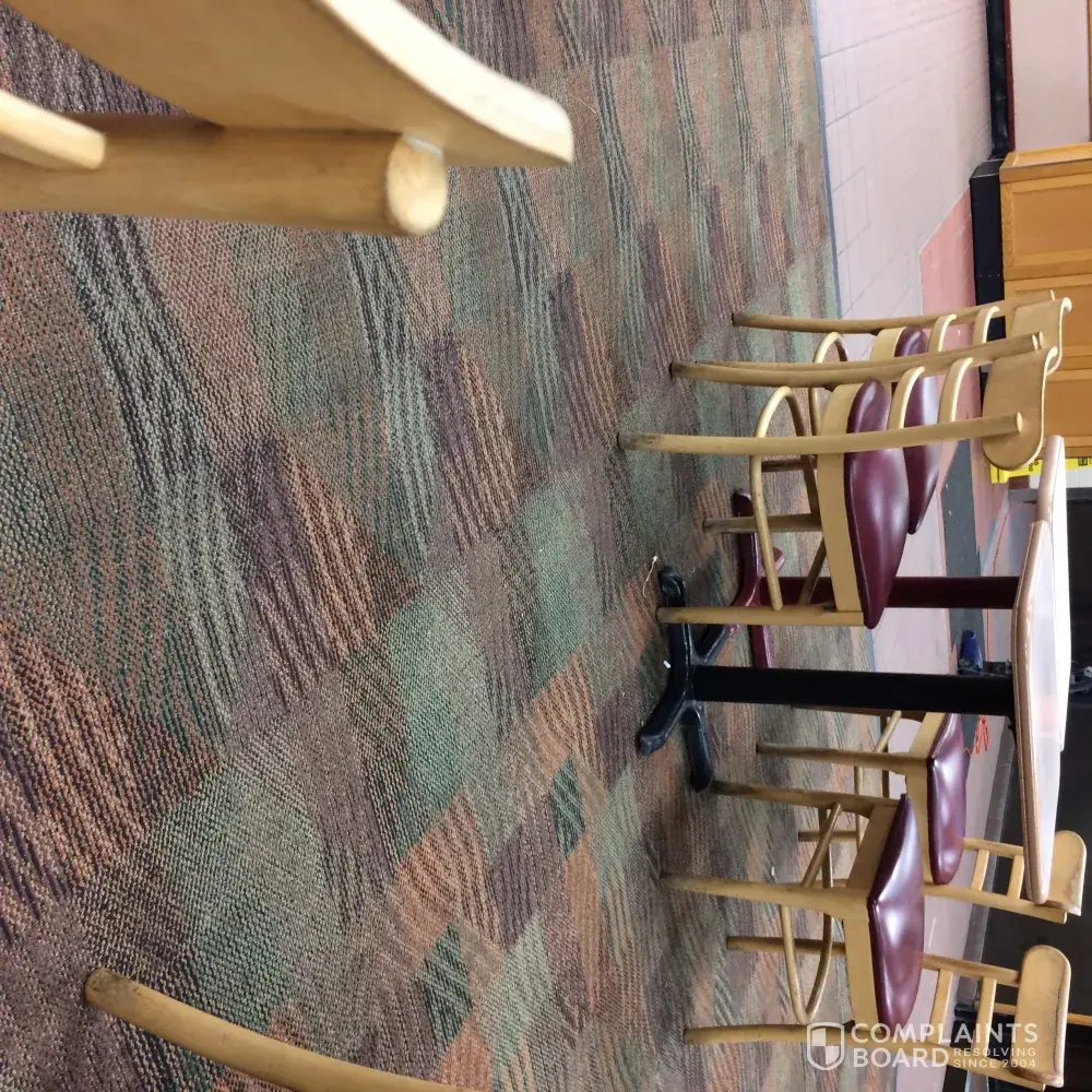 The wallpaper on the walls is peeling and falling off everywhere, especially in the corners and up near the registers. Some windows sills have water damage and possible mold issues. The wainscoting under the windows had visible signs of water damage and has been cheaply painted over with black paint. There is also water damage to the ceiling tiles. The chairs are very dirty everywhere and the finish is badly worn off them. The tables and chairs are very outdated. The hallway tiles are loose, and are also falling off at the bottom of the wall, with broken chunks of wood exposed. Many floor tiles have been replaced with several different colors. The windows are dirty.