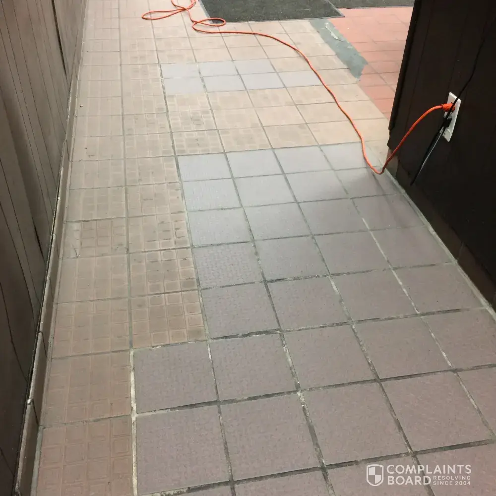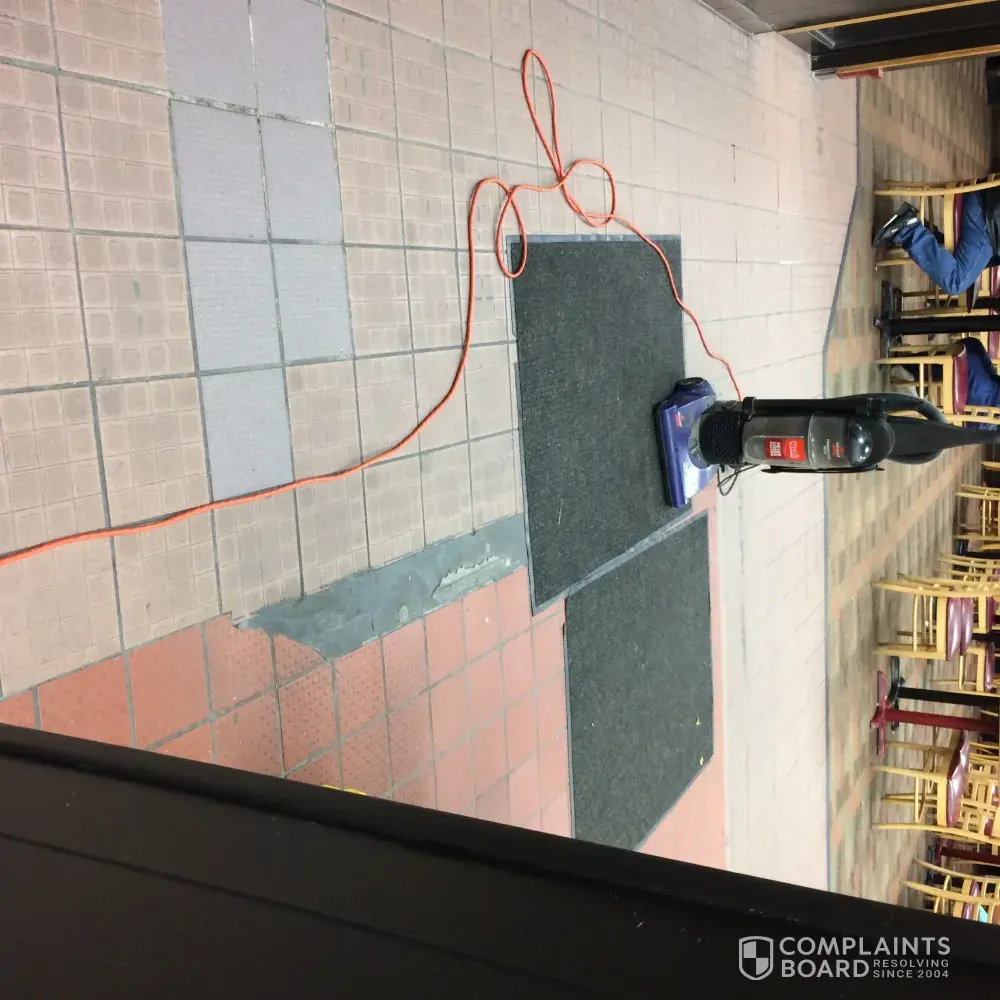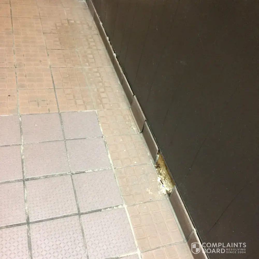 The wallpaper on the walls is peeling and falling off everywhere, especially in the corners and up near the registers. Some windows sills have water damage and possible mold issues. The wainscoting under the windows had visible signs of water damage and has been cheaply painted over with black paint. There is also water damage to the ceiling tiles. The chairs are very dirty everywhere and the finish is badly worn off them. The tables and chairs are very outdated. The hallway tiles are loose, and are also falling off at the bottom of the wall, with broken chunks of wood exposed. Many floor tiles have been replaced with several different colors. The windows are dirty.