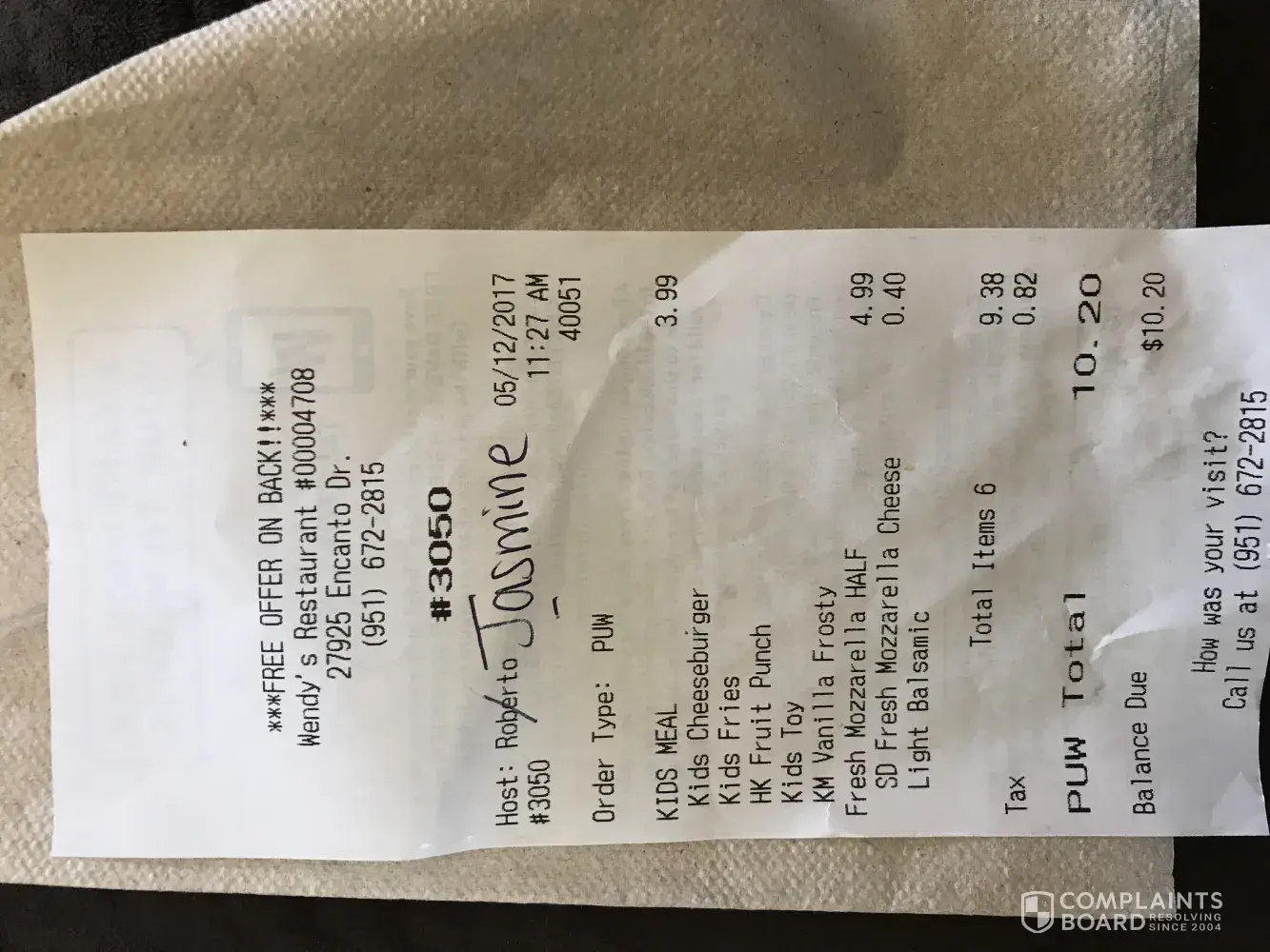 Hi there. We are Wendy's regulars and today was pretty annoying. We ordered a grilled chicken combo. Chicken strips with side salad balsamic dressing. And we got a disgusting cod burger instead of chicken no sauce for the strips and ranch for the dressing. It's just maddening because I looked in the bag and everything appeared to be there but a deep fried fish burger instead of grilled chicken was not a good trade. We live just a bit too far to go back and get things fixed. It's probably just the staff being incompetent but it was annoying and disappointing to say the least. Especially at this price point.