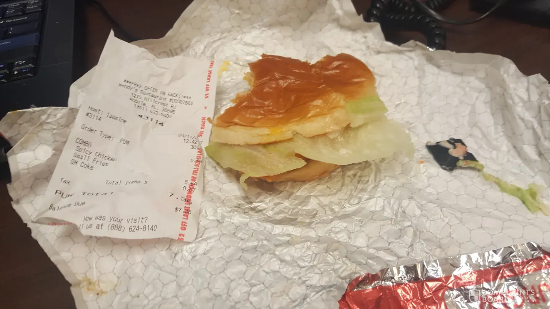 Photo of receipt and sandwich attached