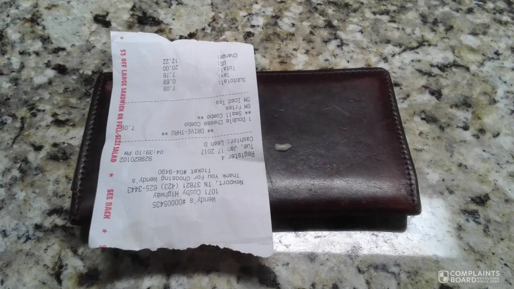 This is a picture of my receipt and veneer that broke off of my tooth after biting into a hamburger that apparently had a piece and bone in it.