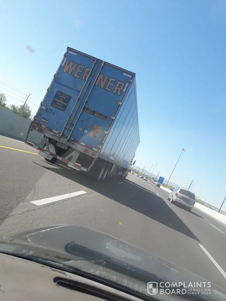 I called 911 to report his behavior. A State trooper took the information .We couldn't get the license plate no. . So shook up! We then stopped at the N.Y. State troopers Authority building to personally report this, but no one was there. Then we saw the Werner truck flying down the highway. We are both Senior citizens and could not believe this act of "Road Rage Aggression". My husband is a professional driver for 11 yrs. With a car delivery comp., With perfect credentials. We are seriously considering contacting our lawyer to file suit. We feel if my husband didn't act so fast, we would have been "killed" ! we were driving a small SUV, which wouldn't have saved us from a huge tractor trailer! We hope you address this "serious' complaint and act accordingly. and return a response to us.