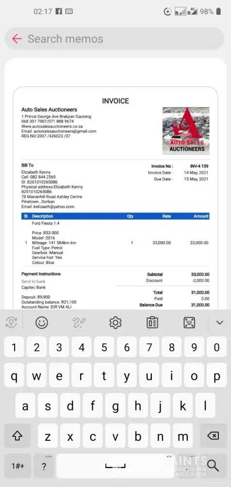 On friday 14 May i saw and ad on Facebook regarding a vehicle sold by an auction company called auto sales auctioneers. Upon my query of purchasing the vehicle they gave me an invoice which they said i can verify. I now called wesbank to verify the company. A lady who assisted me now told me that indeed the company is legit and i can proceed to purchase my vehicle through the auctioneers. I managed to make a reservation fee of R4100 to reserve the vehicle. I noticed something is not right cos they began to persist me to pay the whole amount of. R31000 of the vehicle price.