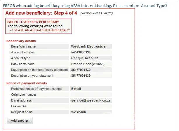 I need to make an urgent payment over the Internet from Standard Bank to Wesbank. It would not accept. Said I need correct Beneficiary Format. I spent the entire afternoon yesterday phoning several numbers Enquiries, Settlements, Arrears and each person told me differently. Still cannot make the payment.