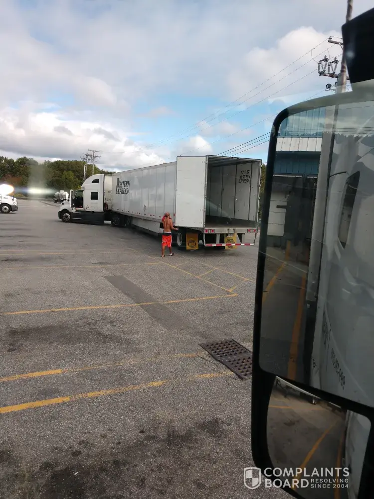 Western Express employee at Poland Spring Water plant in Poland Spring ME in flip flops and no shirt with shorts hanging halfway down his legs and underware fully exposed and the most ignorant look on her face. Western Express, you can do better.