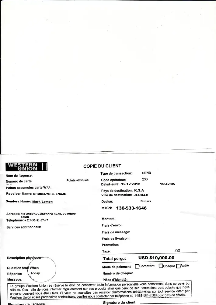 Is this true and the names stated below are they connected to your company in western union cotonou city benin? Can you give me an answer immediately please