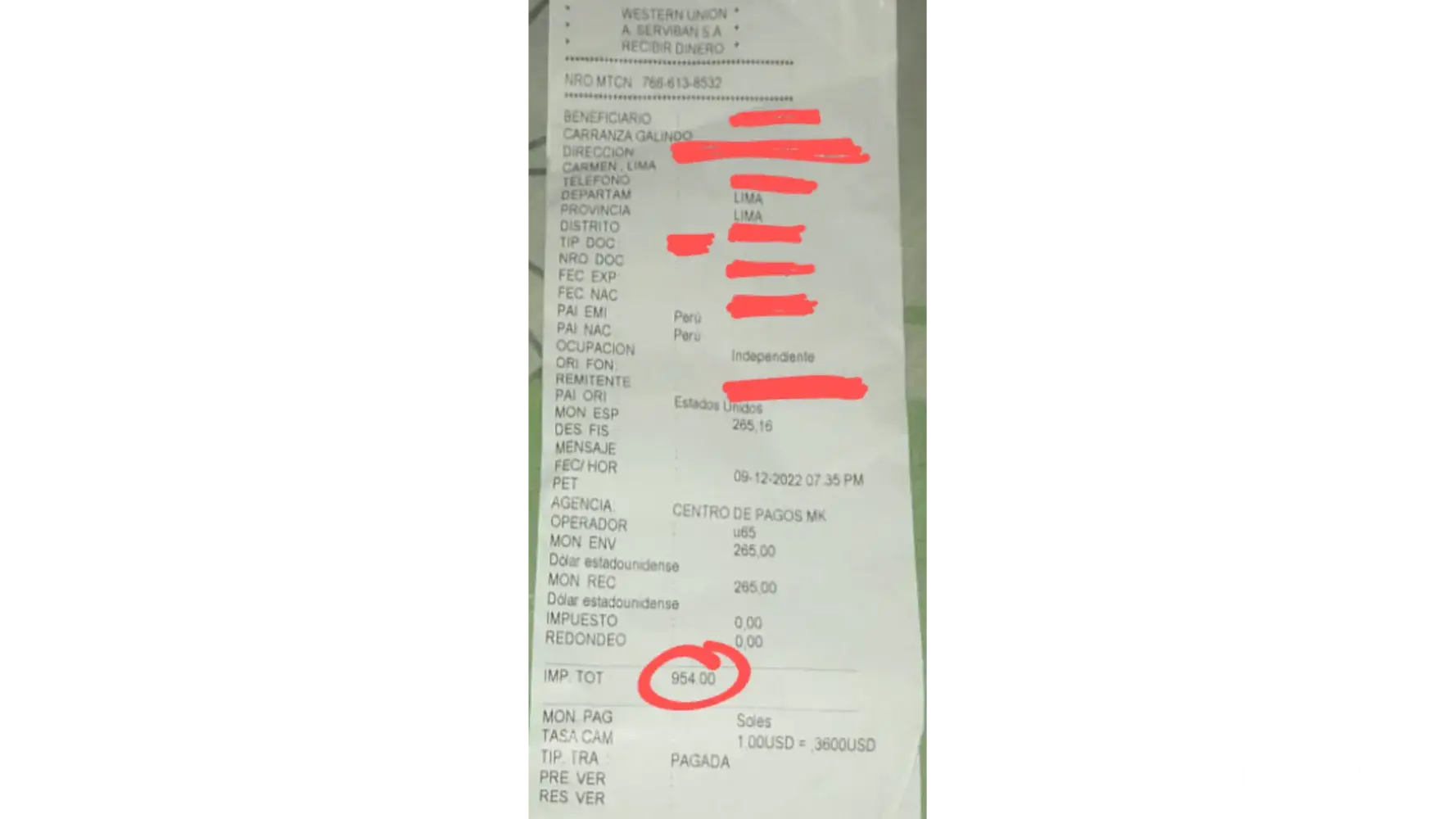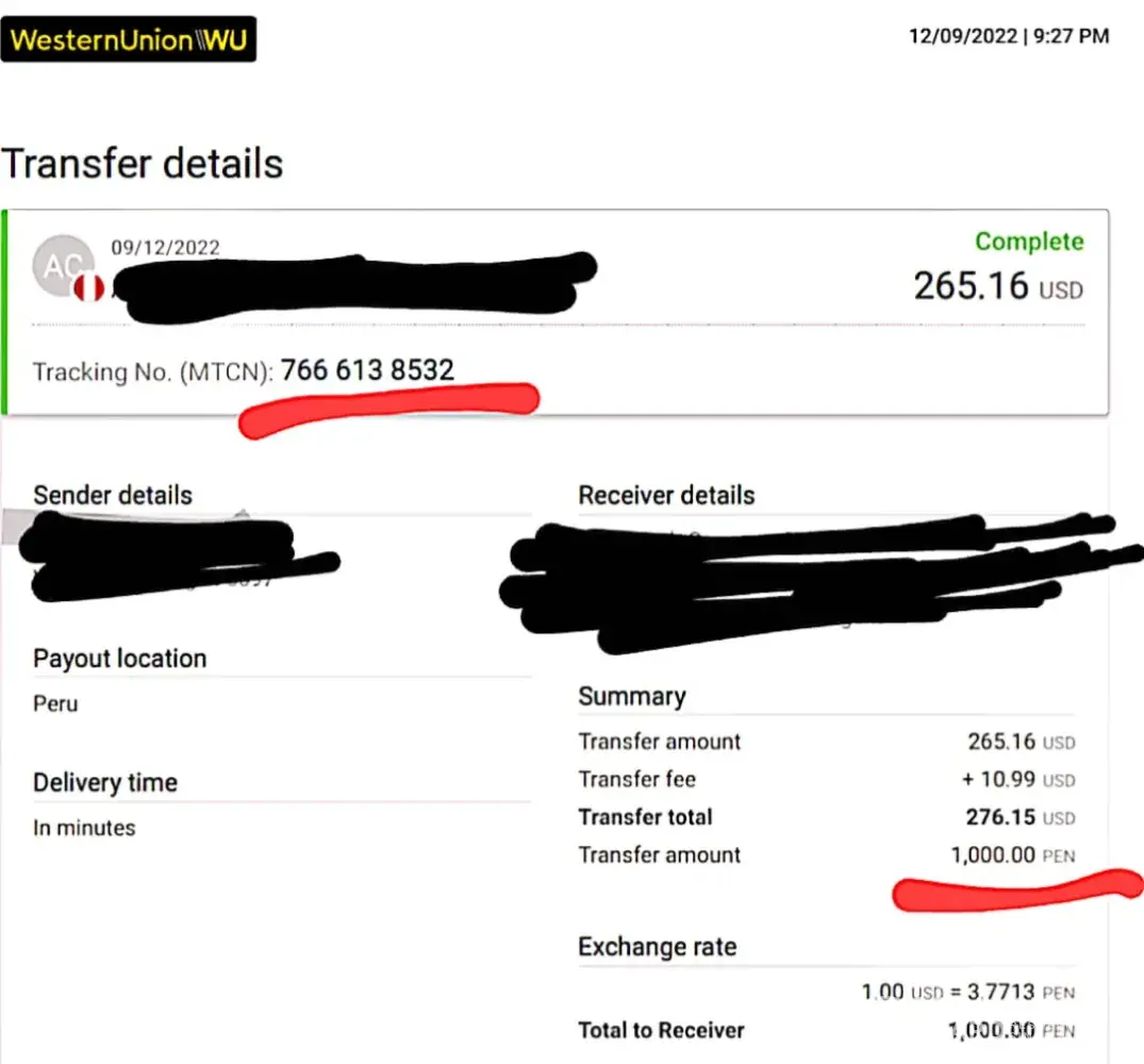 Please investigate wrong amount was given to my family member see receipts are NOT the same when it comes to the given amount for pick up, $20 was missing from the total amount, and educate the branch in Lima Peru to not take money away from customers, this money was for my sick elderly father medicine.