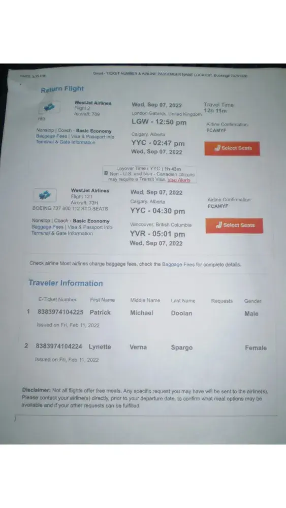 2. Westjet itinerary revisions were made mere hours before departure.