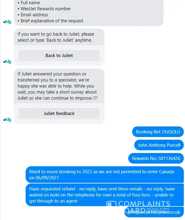 We have tried to contact Westjet to resolve this issue for the past 3 weeks without success as follows: