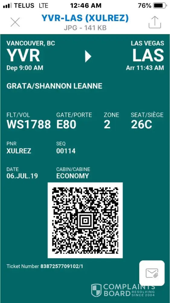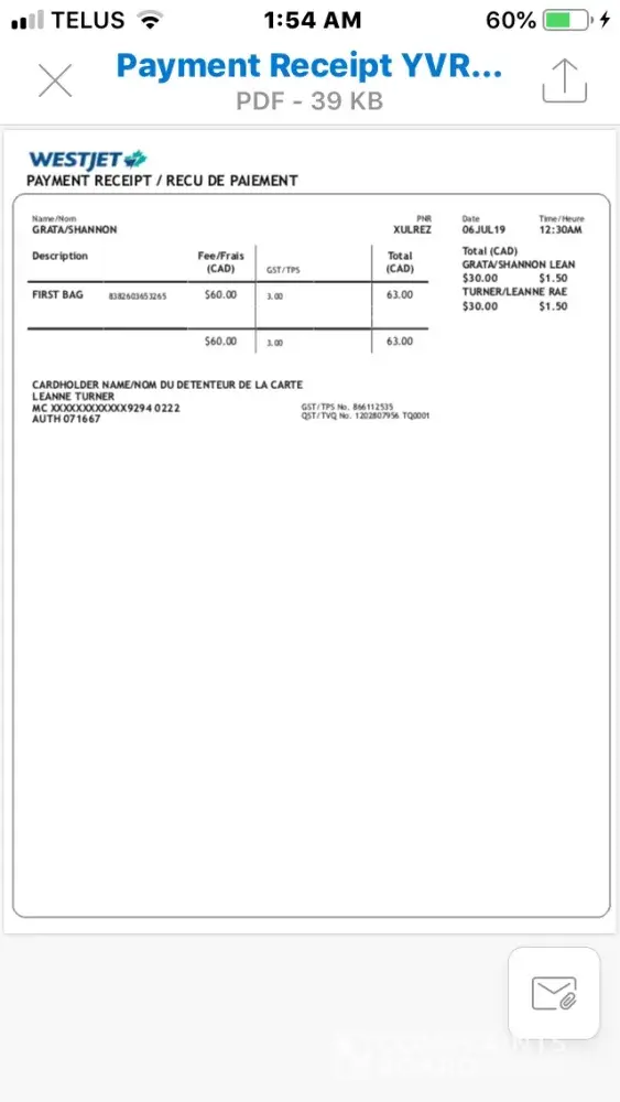 Subject: FW: WestJet flight 1119 to Toronto (GQTZOH)