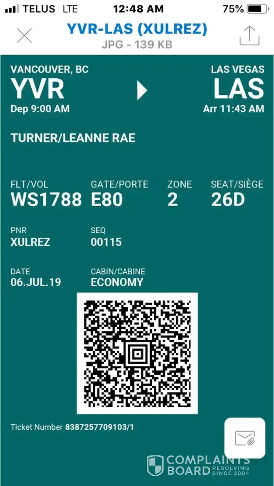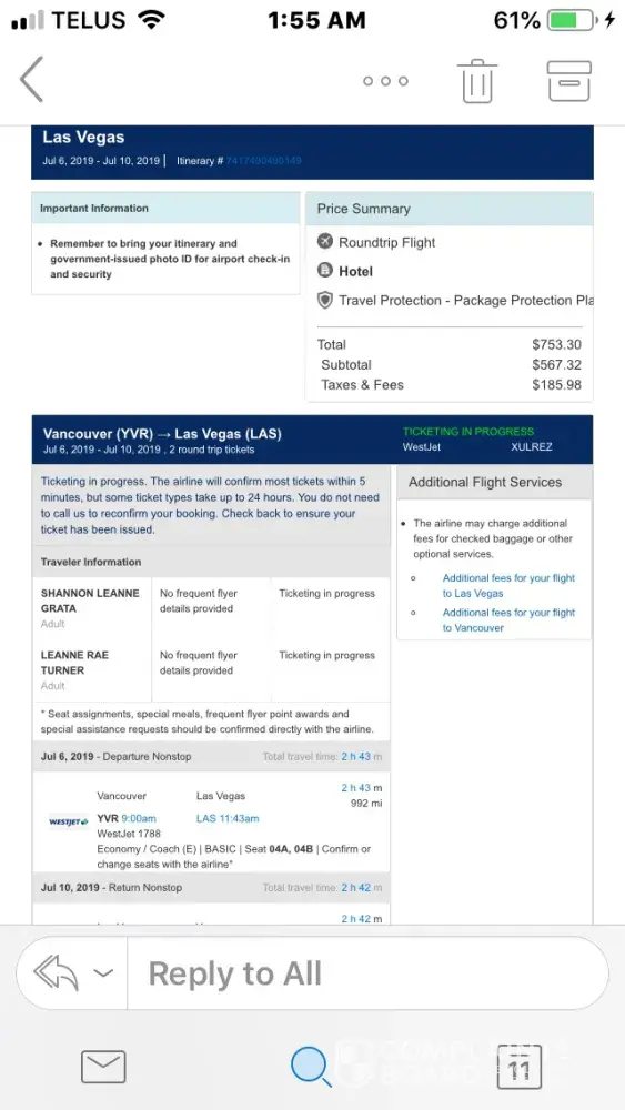 My friend Leanne Turner and I purchased return tickets through Travelocity on West Jet leaving from Vancouver on July 6, 2018 at 9am arriving in Las Vegas 11:43am. returning back home on July 10th.