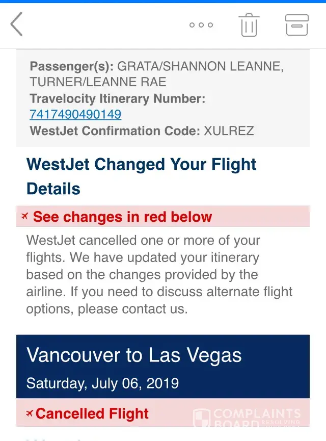 As I was on the phone with Travelocity West Jet cancelled both our flights. At that point Travelocity said it was out of their hands and we had to go back to the West Jet counter.