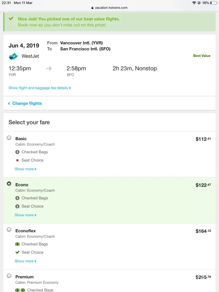 I've booked a flight fr Vancouver to San Francisco westjet 1774 for June 4, 2019 through hotwire for $143.17 each for 5 passengers totalling $715.85 with booking number [protected]. I booked this flight early thinking i got a cheaper rate than if i book closer to our departure date. When i recheck with hotwire right now, i am saddened to find out that the cost of my booked flight got cheaper. It is now only $122.47 each @ 5 passengers = $612.35 or $103.50 more. Can i use the difference to pay for our bags instead of a refund? I would greatly appreciate your response on this matter, thanks