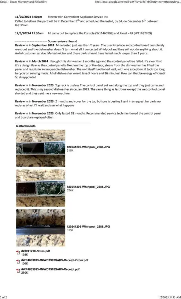 During the time between the repair call and the dishwasher being fixed I did some research, some of the reviews are listed below. Many reviews indicated the adhesive on Console (W11460908) allowed water (steam) to leak down to the Panel – UI (W11632709). I have attached several photos showing exactly that. (Photos attached to the email) I can tell you we do NOT use the drying function of the dishwasher, rather we open the door and allow the dishes to air dry. So the steam must be coming when the dishes are being washed.