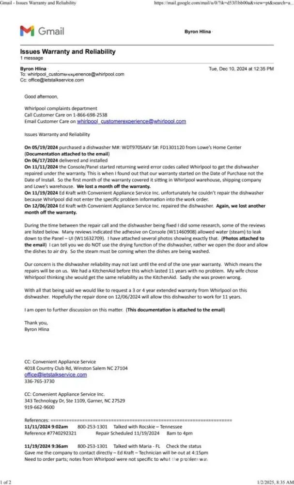 On 11/11/2024 the Console/Panel started returning weird error codes called Whirlpool to get the dishwasher repaired under the warranty. This is when I found out that our warranty started on the Date of Purchase not the Date of Install. So the first month of the warranty covered it sitting in Whirlpool warehouse, shipping company and Lowe’s warehouse. We lost a month off the warranty.