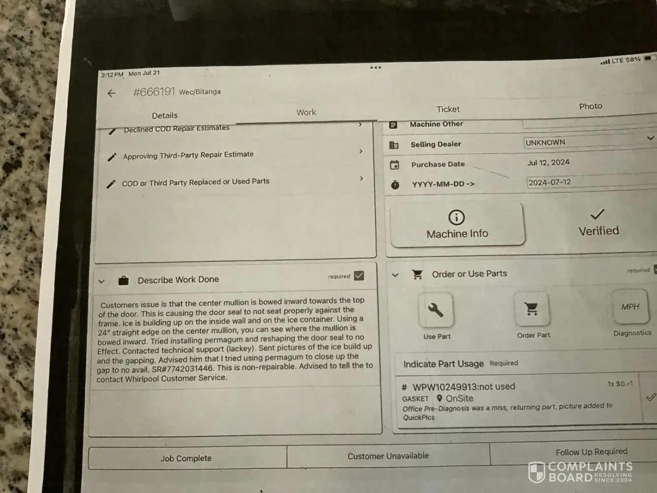 On 11/19/2024 Ed Kraft with Convenient Appliance Service Inc. unfortunately he couldn’t repair the dishwasher because Whirlpool did not enter the specific problem information into the work order.