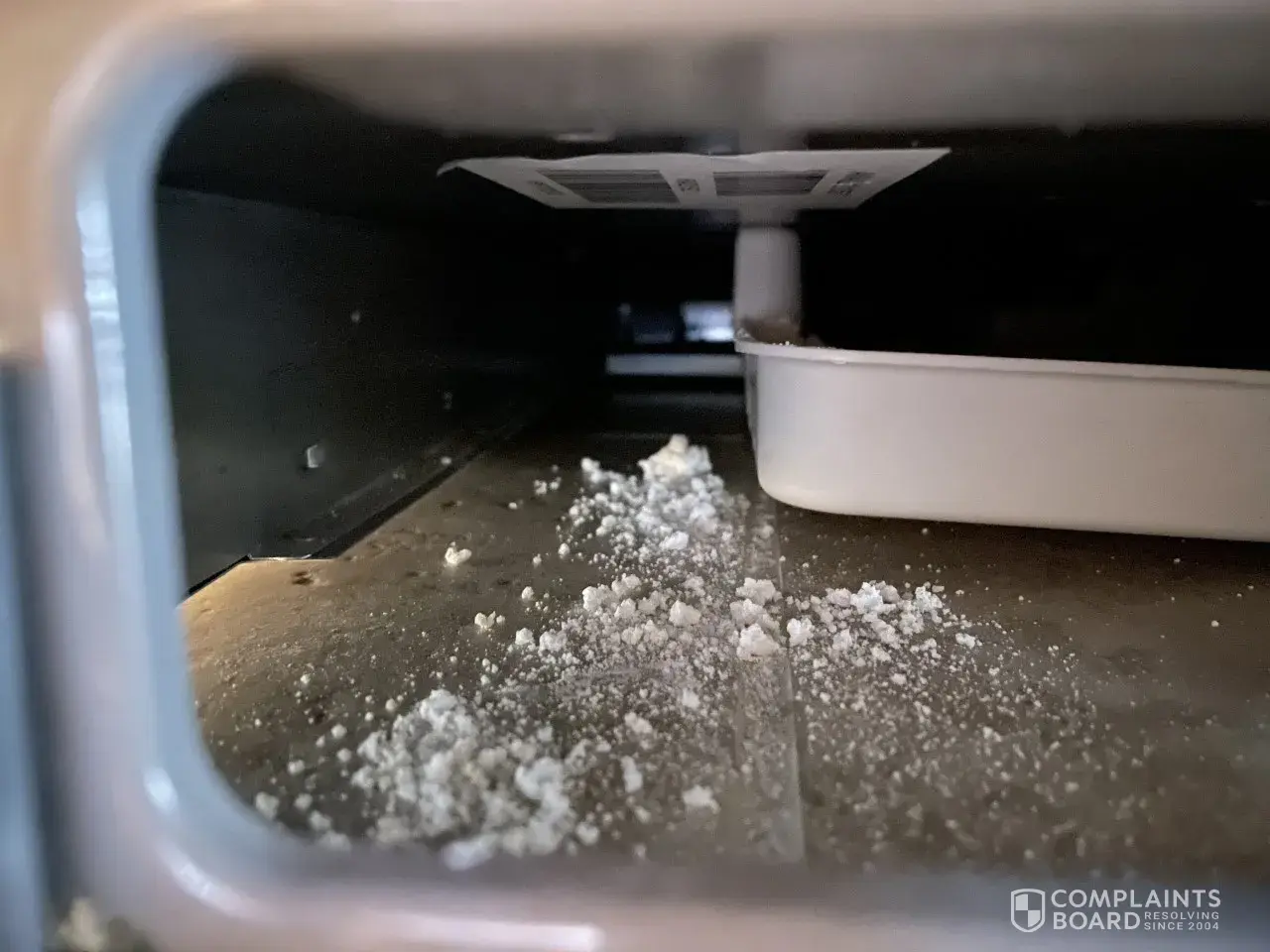 We purchased our Kitchenaid refrigerator model #KRFF707ESS01, serial #F82977910 in October of 2018. In May of 2022 I noticed a off whote powdery substance under the botton freezer in the drip pan. I was finding this substance on my floor and was searching for the origin of it. I had Raliegh Appliance Repair out to see what it was and where it was coming from. He could not figure out what it was, he contacted Kitchenaid and they had no idea what it was. I called Kitchenaid in 2022 trying to resolve this and they had no clue what is could be, I asked if I could send a sample to their labs to make sure it wasn't harmful, I was told they don't have a lab. I emailed Kitchenaid in June of 2022 trying to get a recommendation of a lab to have the substance tested, with no rsponse. I just had Platinum Service out a Kitchenaid repair service, they also had never seen anything like this before and could not figure out what it was. We have a small dog and 6 grandchildren, my hope is that the substance is not harmful, our dog has developed pancreatitis in 2020, dogs will eat anything they find on the floor. I do my best to clean up the particles when I see them. There is no way to get to the drip pan to completely clean out the substance as it accumulates.
