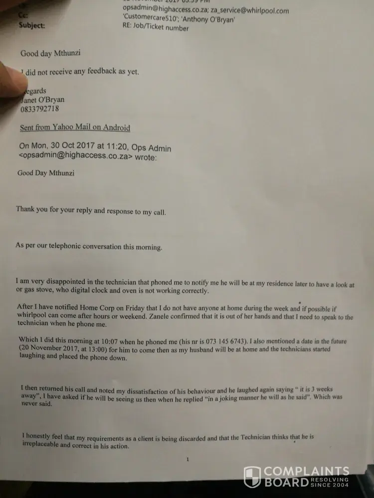 Good day. A technician contacted me on 30/10/2017, saying he can see me now. I was at work and not available. I have no maid or person at home during normal working hours. My husband was on leave 20 /11/2017. Appointment was for 13:00 technician now show. Whirlpool supervisor assist with phone call to technician, which I could also do (his nr [protected]) . I have call log nr # 14629, fault with my oven clock This has been a problem for more than a year now, would like to have it fixed. Please confirm a way forward as I am only at home again during office hours on the 18+ 19 December 2017. And due to resent avents I can not book a reliable technician for then.