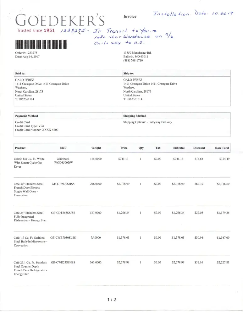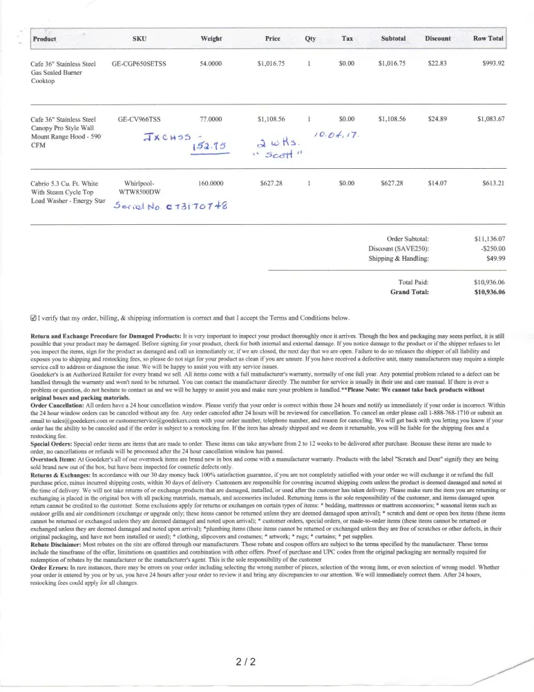 I bought this washer on August 14th, 2017 from Goedekers, (order No. 1233275) . It was installed on October 6th, 2017 and paid $613.21.